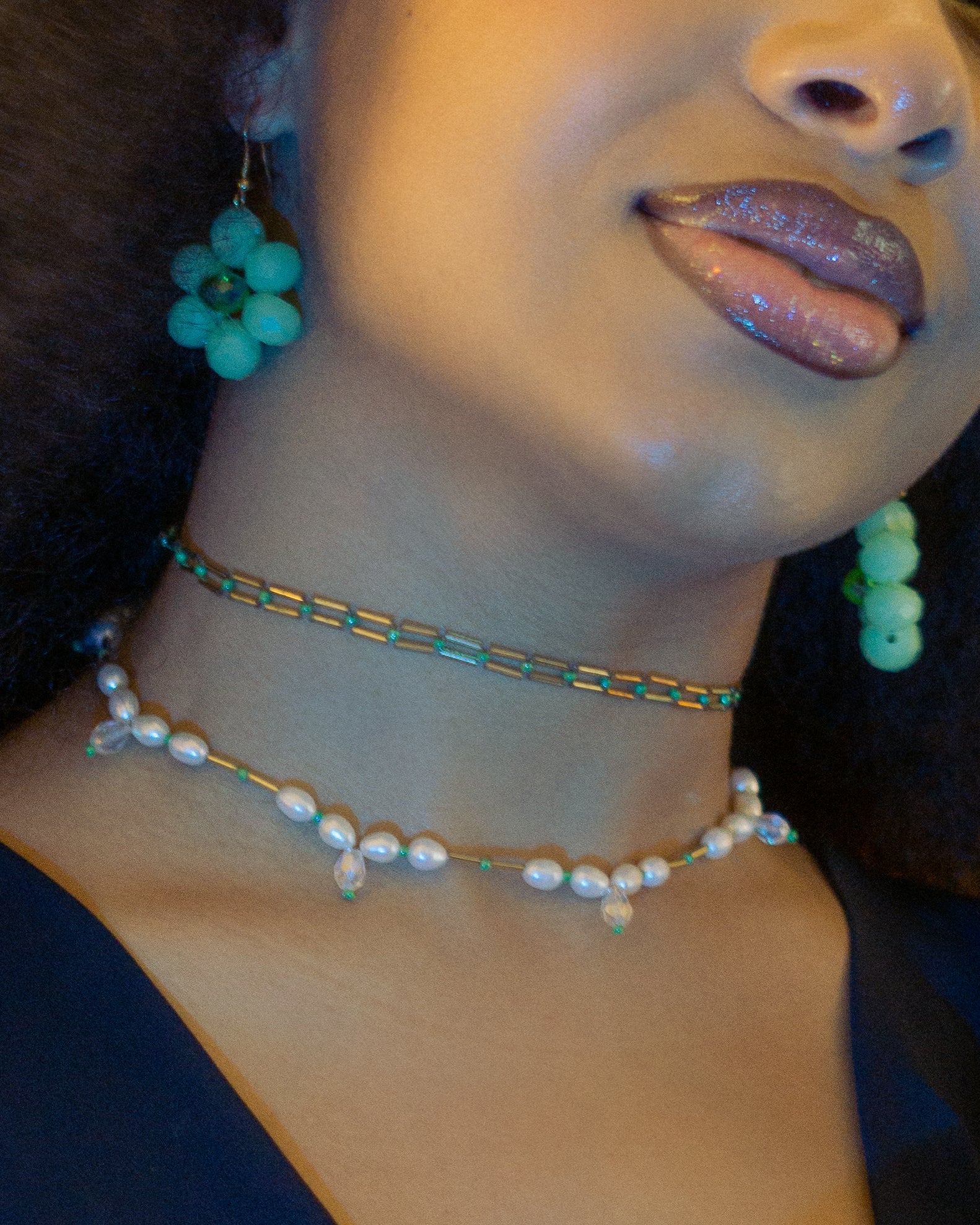 Découvrez le joyau captivant de la Collection Classiques : le choker Lolita. Façonné à partir de perles de verre dorées, tissées à la main avec minutie pour former une chaîne délicate. Ce choker évoque l'élégance sophistiquée des rêveuses audacieuses qui osent exprimer leur individualité à travers chaque détail de leur style.
