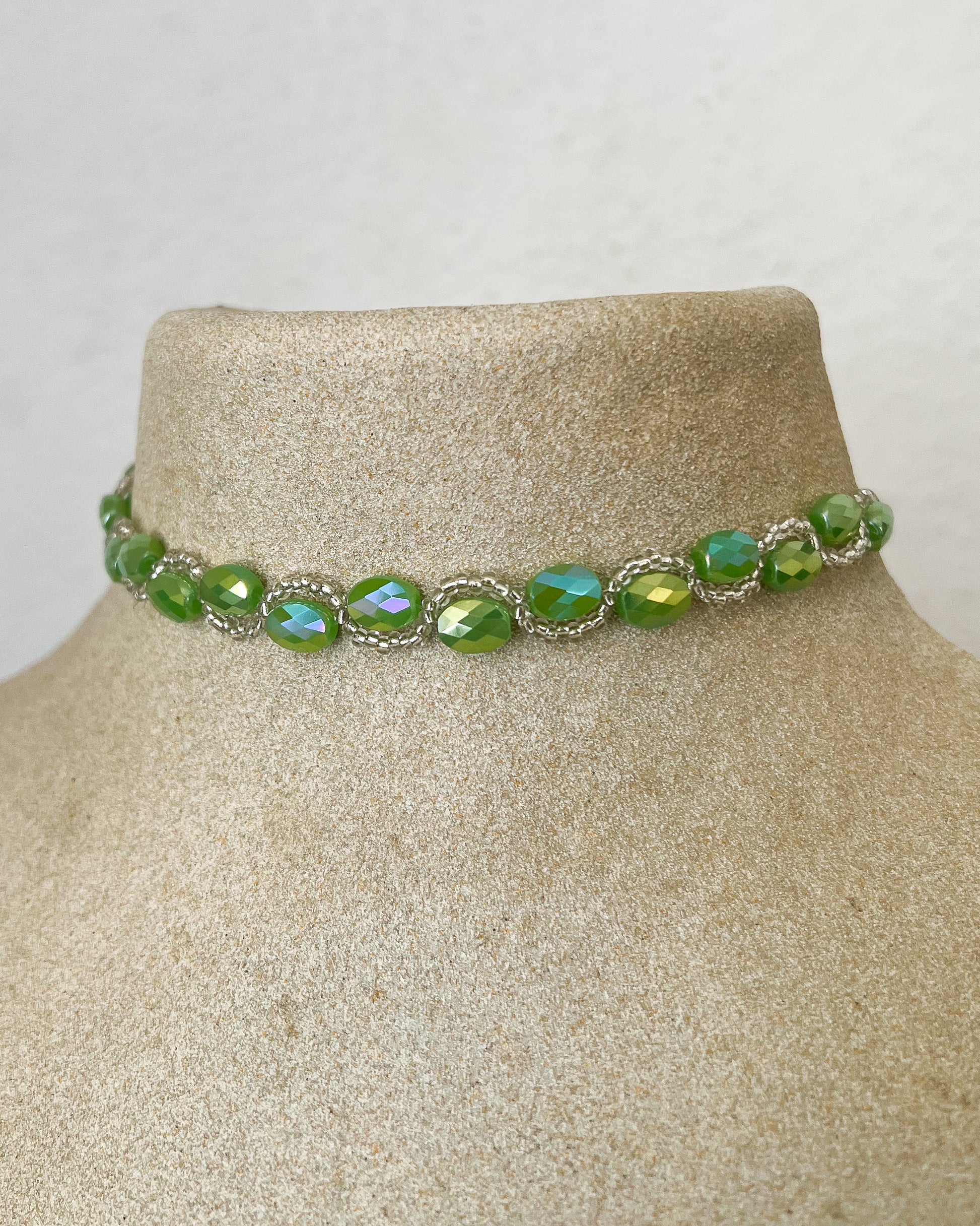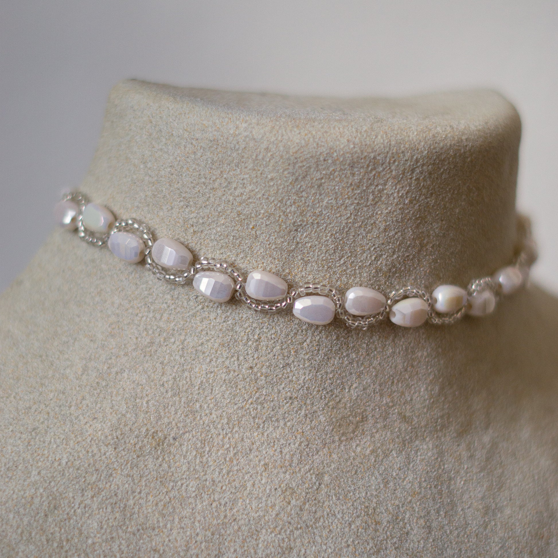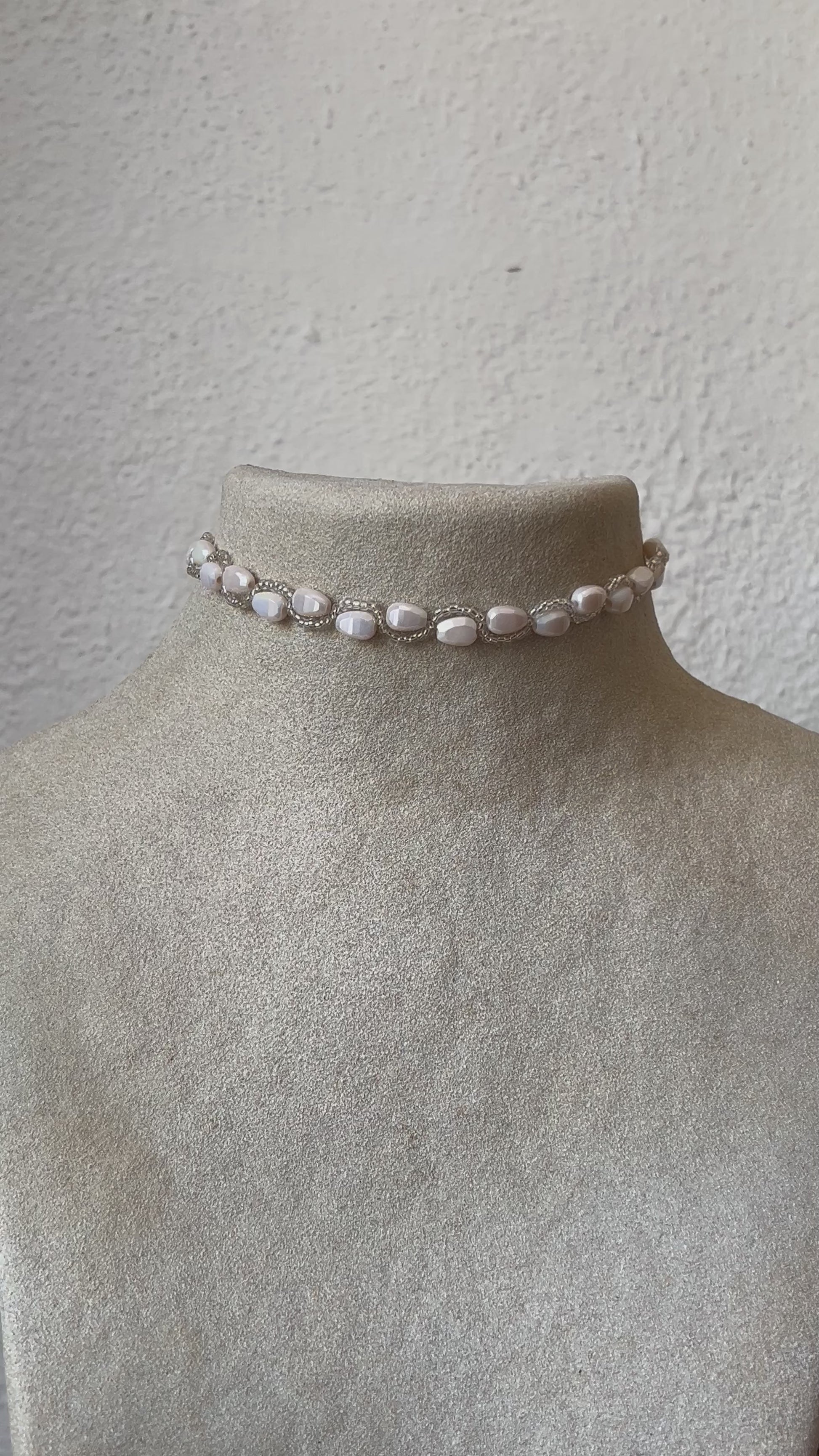 Le subtile collier Mother of Pearls. Ce bijou ras de cou est composé de perles de cristal beige aux multiples reflets, habilement entrelacées de perles de verre argenté. Sa discrétion est son atout majeur, mais son effet est indéniable, témoignant de la technique et de la délicatesse investies dans sa création.