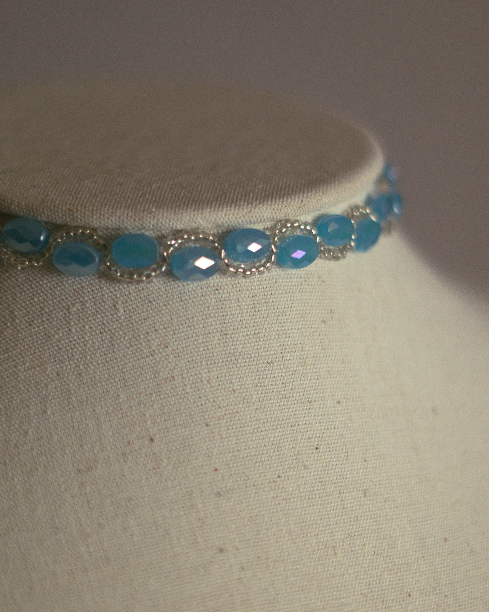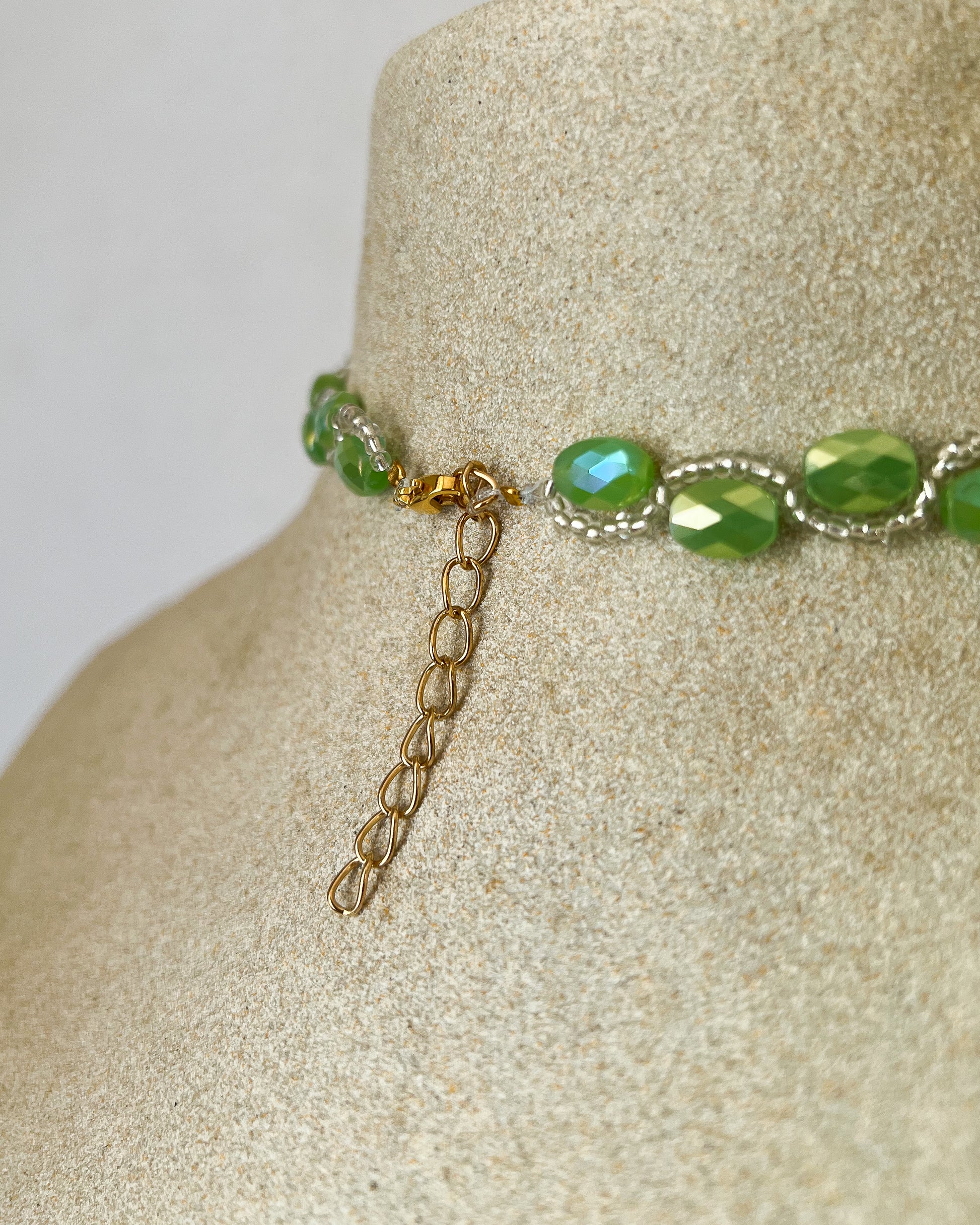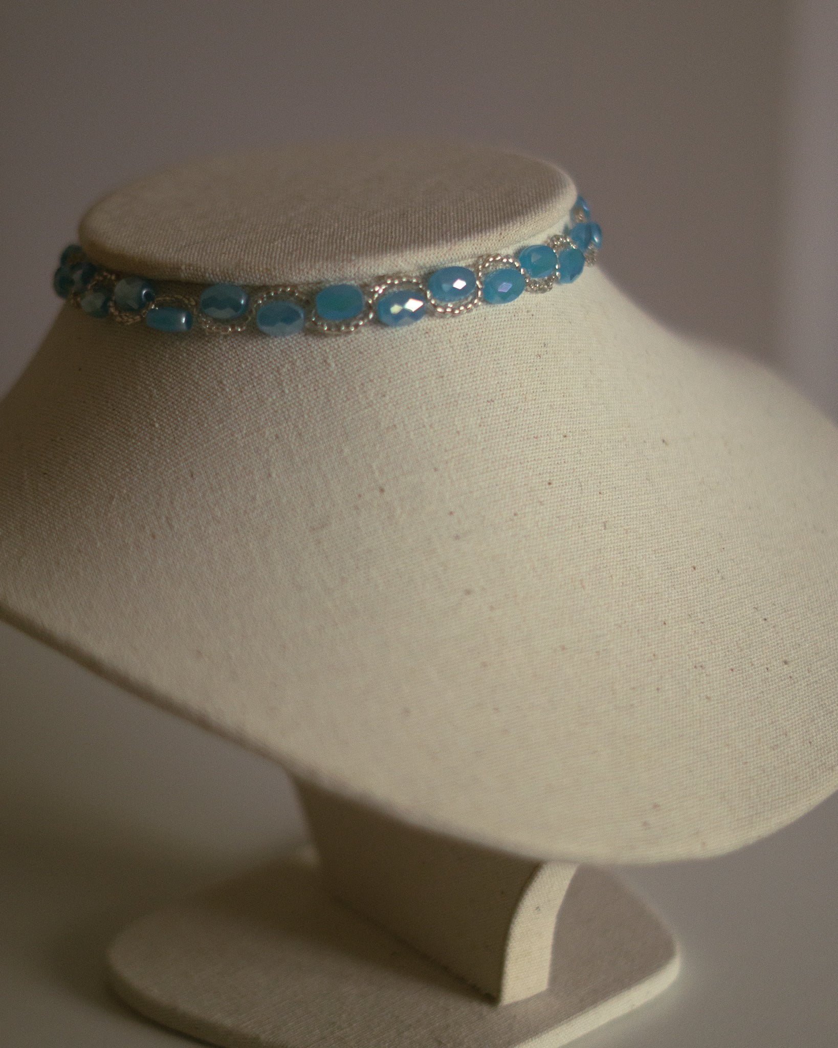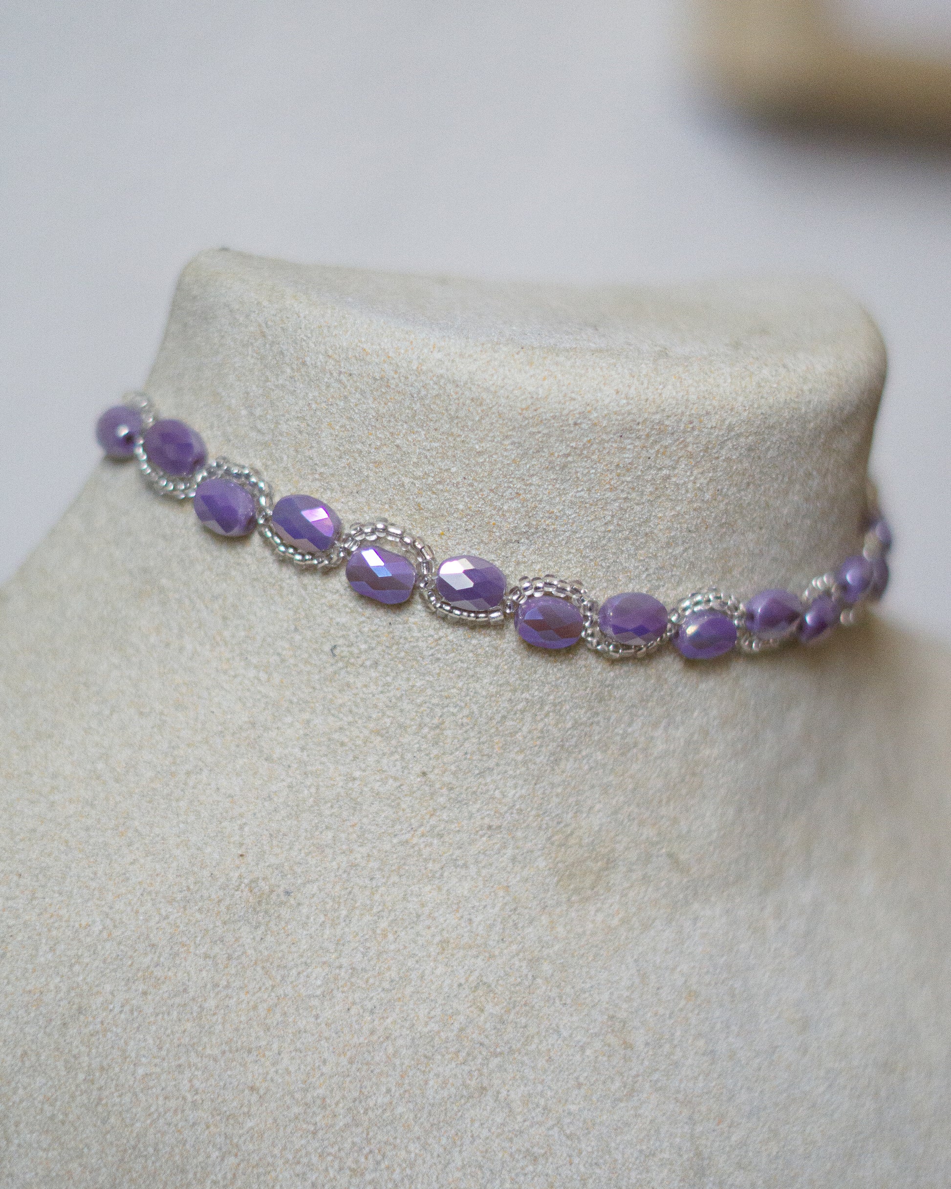 Le subtile collier Mother of Pearls. Ce bijou ras de cou est composé de perles de cristal beige aux multiples reflets, habilement entrelacées de perles de verre argenté. Sa discrétion est son atout majeur, mais son effet est indéniable, témoignant de la technique et de la délicatesse investies dans sa création.